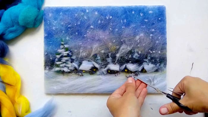 4. Завершающий этап: накладывание стекла на картину и обрезание излишек шерсти; оформление картины в рамку.