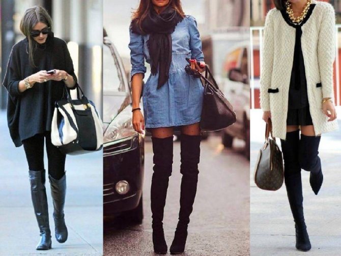 Комбинированные модели. Темный низ в сочетании со светлым верхом будет отлично смотреться на худых ногах. Еще одна вариация на тему – мягкая замша на голенище, складывающая мягкими объемными складками, и кожаный верх, прекрасно поддерживающий форму.