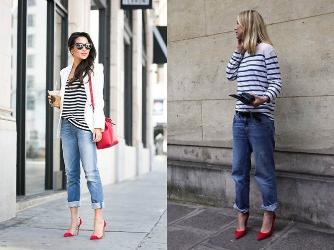 В рамках стиля кэжуал морская тематика в одежде отлично может сочетаться с красной обувью: например, топ в поперечную синюю полоску, напоминающий тельняшку моряков, будет отлично контрастировать с лодочками.