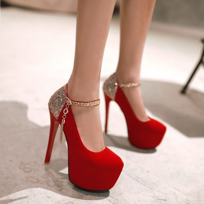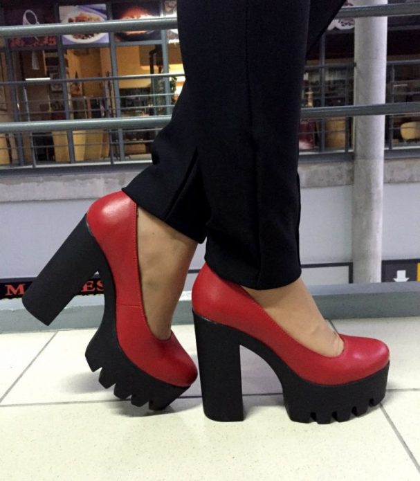 Красные туфли на высоком каблуке и платформе актуальны на вечер
