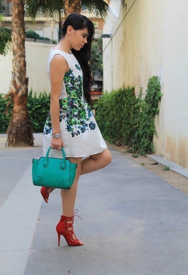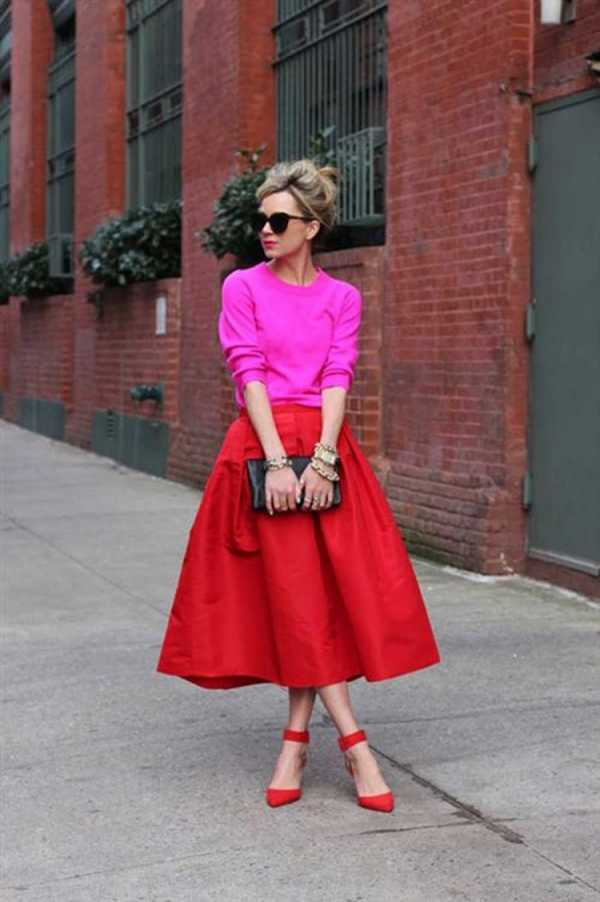 Очень часто под подобную обувь надевают женственные платья. Сейчас в моде юбки миди, и если такой наряд сам по себе может показаться уж слишком традиционным, яркие акценты сделают его действительно интересным. Придать луку дополнительную элегантность можно с помощью головного убора. Образ не должен быть ни слишком ярким, ни слишком бледным — постарайтесь гармонично сочетать насыщенные и светлые цвета в своём комплекте одежды. Хорошо будут смотреться и красные детали, подобранные в тон к обуви.