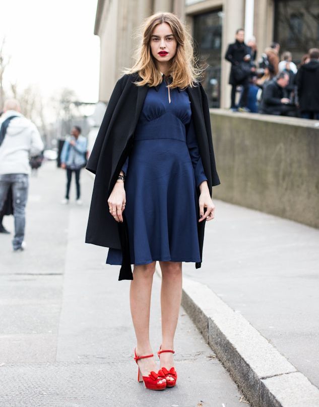 Под красные туфли-лодочки отлично подойдут под простое лаконичное платье