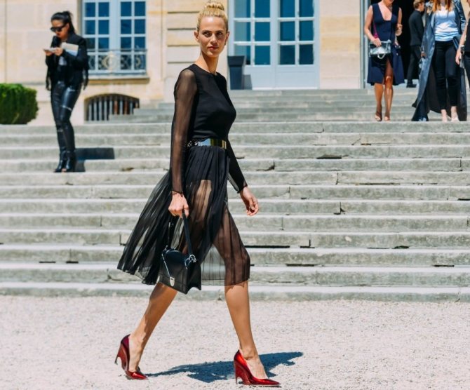 Полупрозрачная плиссированная юбка и блестящие туфли создадут смелый образ на вечер