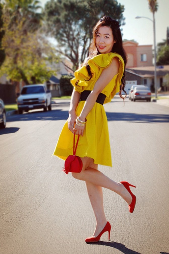 Если вам нравятся сочные лимонные оттенки, они также отлично подойдут под обувь в красных тонах: подобный броский и жизнеутверждающий лук превосходно подойдёт на лето.