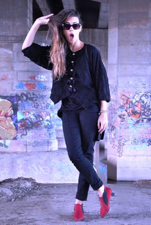 Если вы отдаёте предпочтение облегающим силуэтам и чёрному цвету, для вашего стиля под красную обувь отлично подойдут узкие модели брюк и пиджаки с классическим покроем.