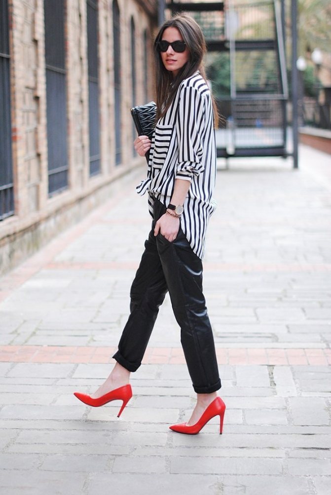 Стиль минимализм сейчас в моде, и он отлично подходит на каждый день. Если вам нравится чёрно-белая цветовая гамма, вы предпочитаете свободные силуэты и простые принты, лёгкие блузы и брюки из мягких материалов составят отличную комбинацию с красными туфлями на летний период.