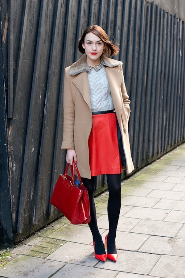 Для любительниц свежих женственных образов подойдёт расклешённая мини юбка, свитер с блестящим воротником и простое пальто. Можно подобрать под туфли элементы одежды или аксессуары в тон.
