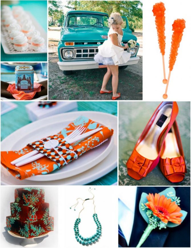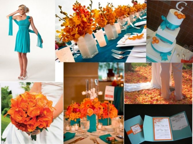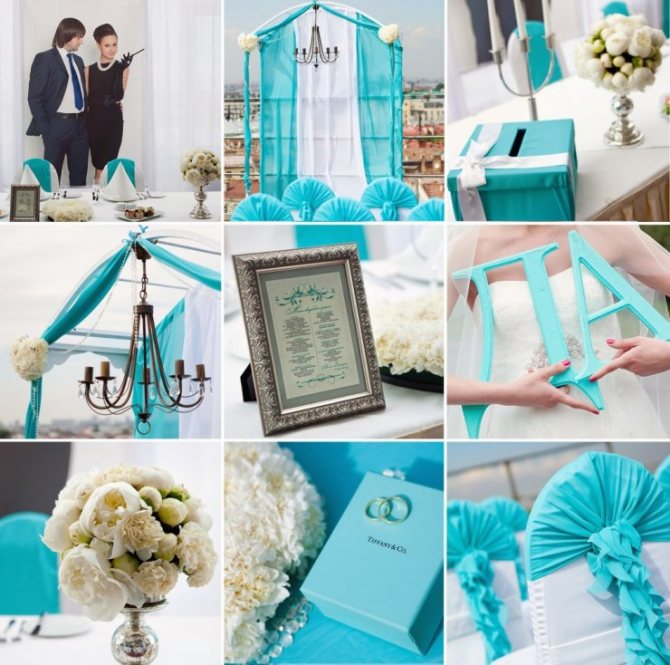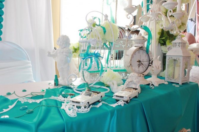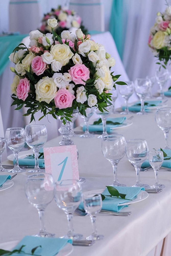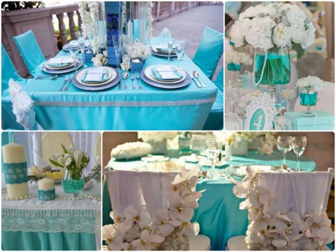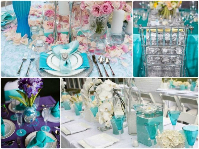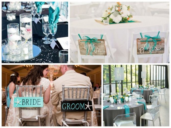 Все оттенки бирюзы в декоре должны гармонировать с образами жениха и невесты. Но не стоит перебарщивать с бирюзовым цветом в оформлении. Лучше умеренно добавлять его элементы в определенный базовый цвет.