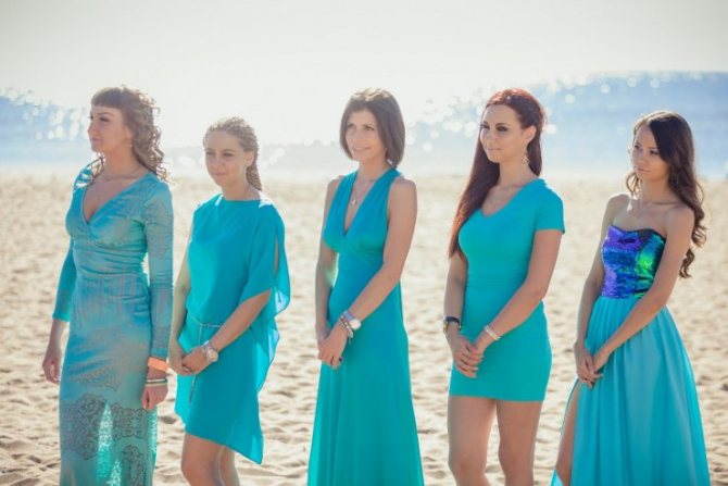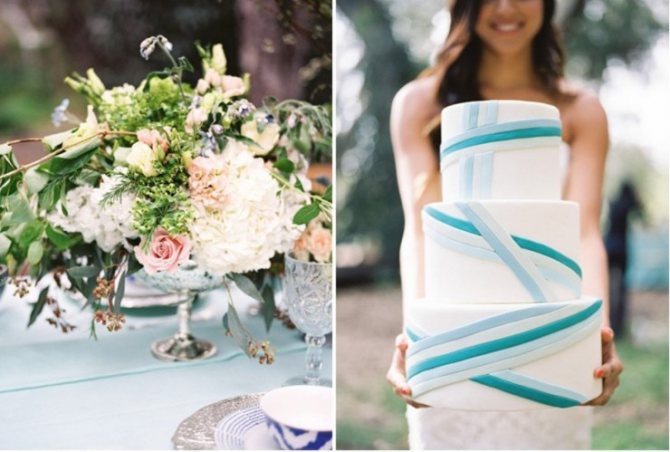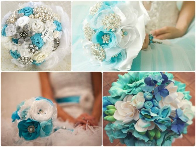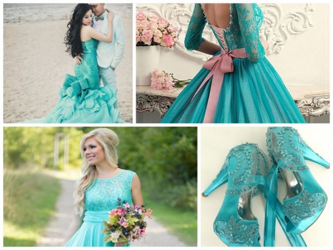 Невеста может надеть и бирюзовое платье, и классическое белое, разбавив его различными элементами цвета аквамарин.