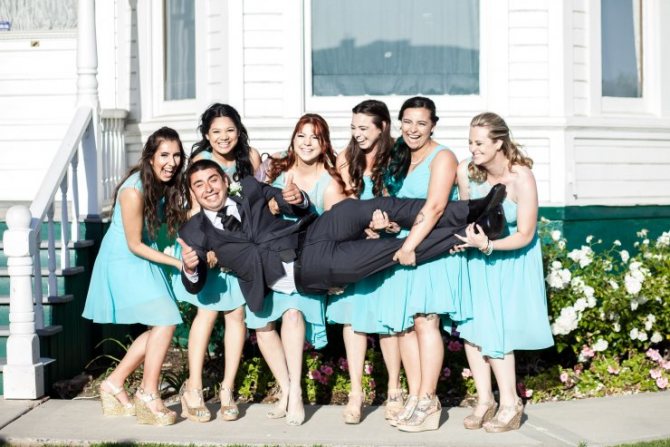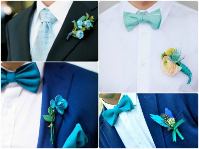 Костюм жениха должен быть либо темнее, либо немного светлее платья невесты. Главное не переборщить с яркостью образов. В случае бирюзового платья – достаточно будет добавить небольшой яркий акцент в наряде жениха, например, выделить цветом галстук или жилет.