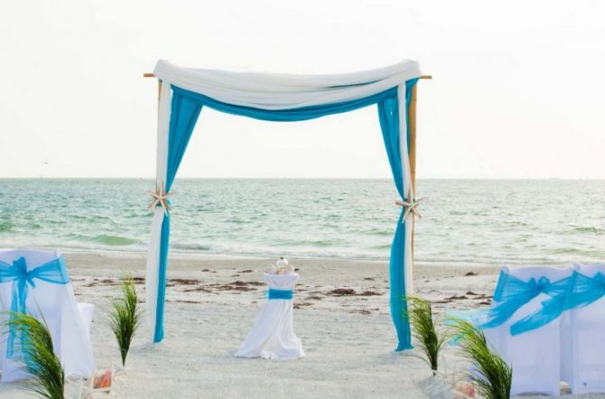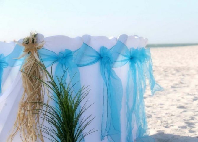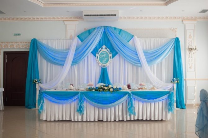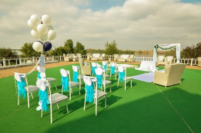 Если торжество проходит на открытом воздухе, можно добавить украшение беседок тканями небесных оттенков.