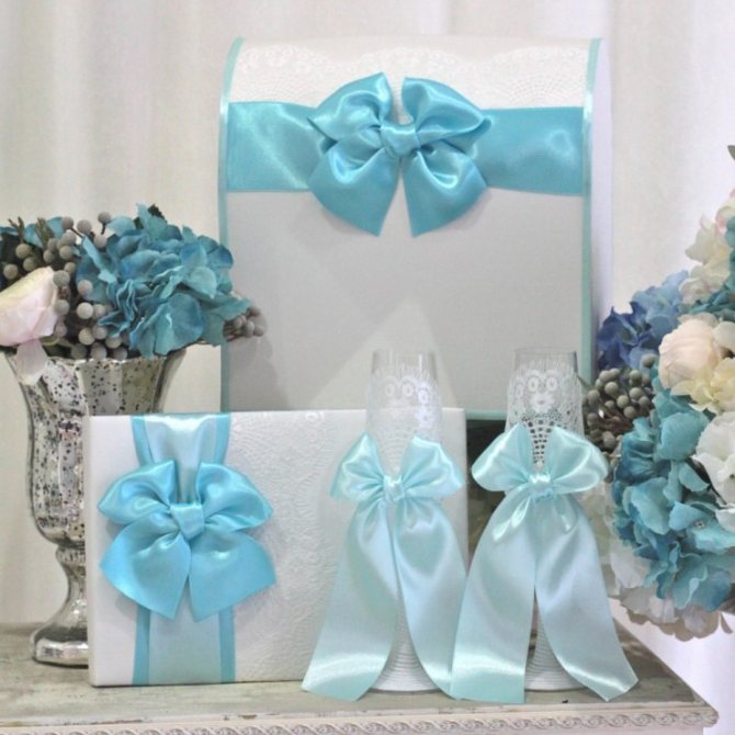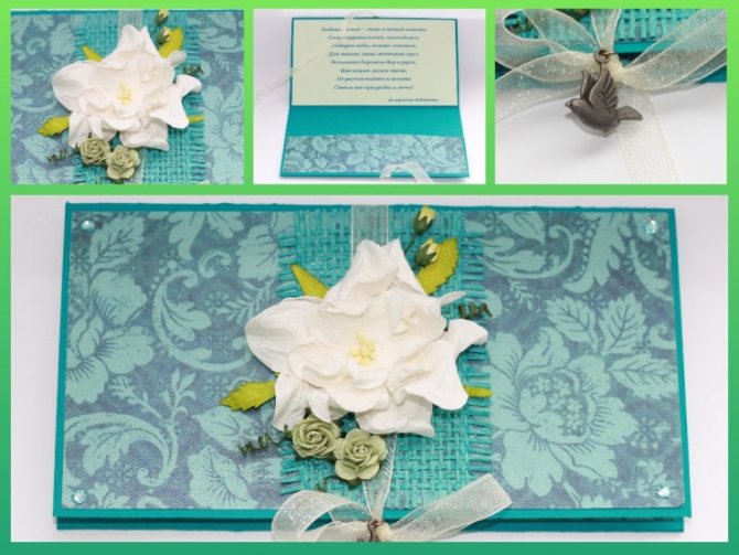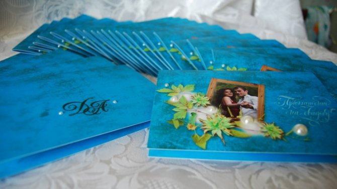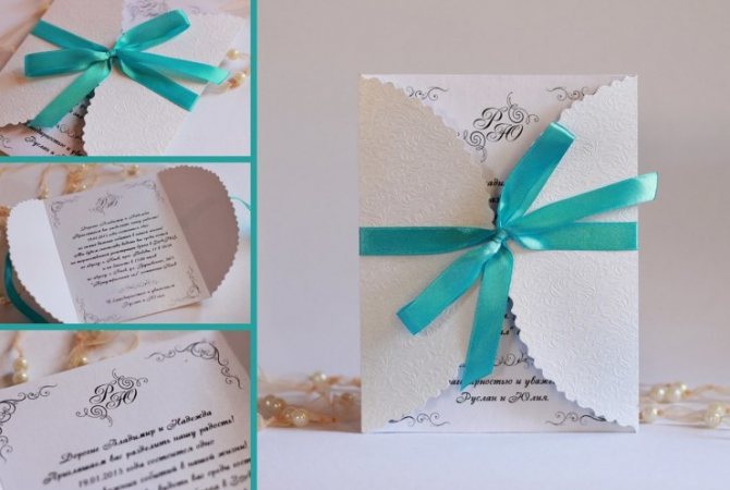 При этом само приглашение может быть напечатано на бумаге бирюзового цвета, либо на белой, но украшено ленточками, морскими ракушками (в случае, если свадьба будет проходить в морской тематике), кружевами, цветами, бусинами соответствующих оттенков.