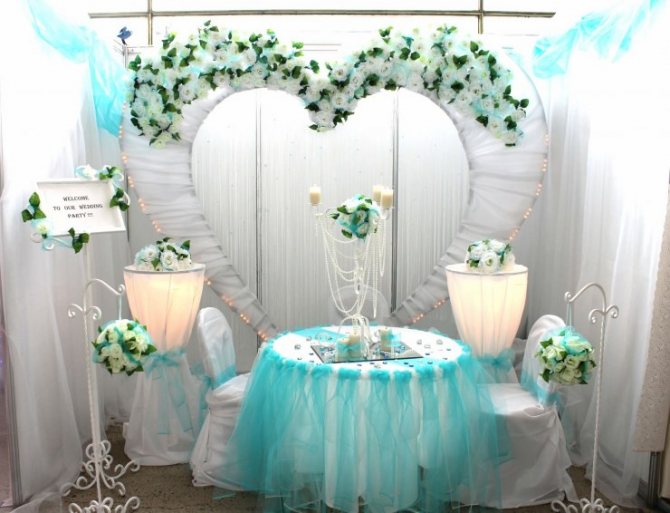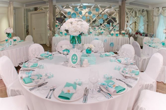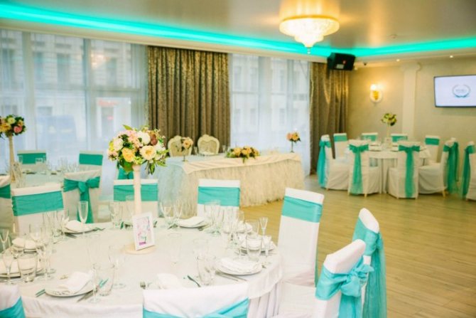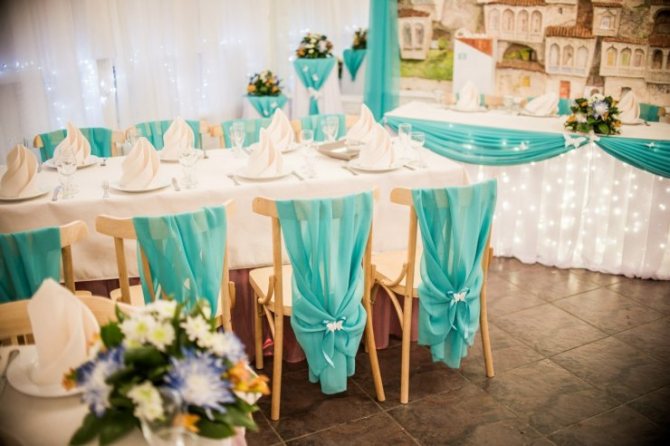 Наилучший вариант оформления зала на свадьбу в бирюзовых тонах – белые скатерти с разложенными на них яркими салфетками, и белоснежные чехлы на стульях, перевязанные бирюзовыми лентами.