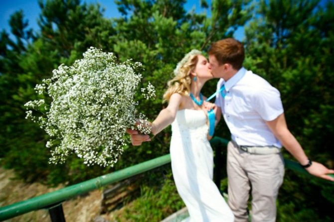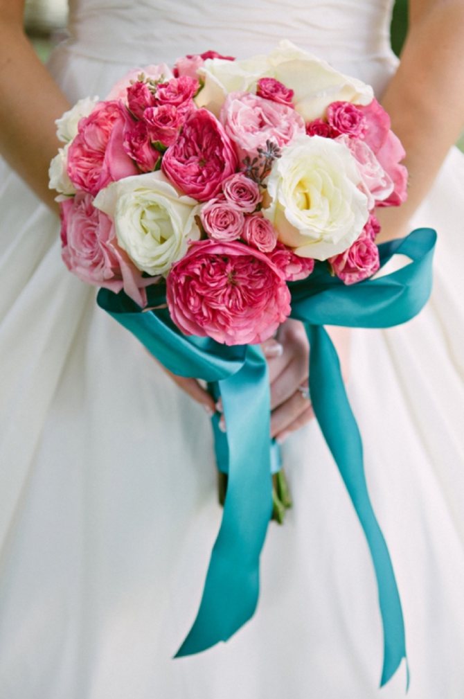 Букет должен гармонировать с платьем невесты, поэтому при выборе белоснежного платья, лучше отдать предпочтение яркому букету, и наоборот, с бирюзовым платьем хорошо будет сочетаться белый букет, который можно украсить лишь яркой лентой.