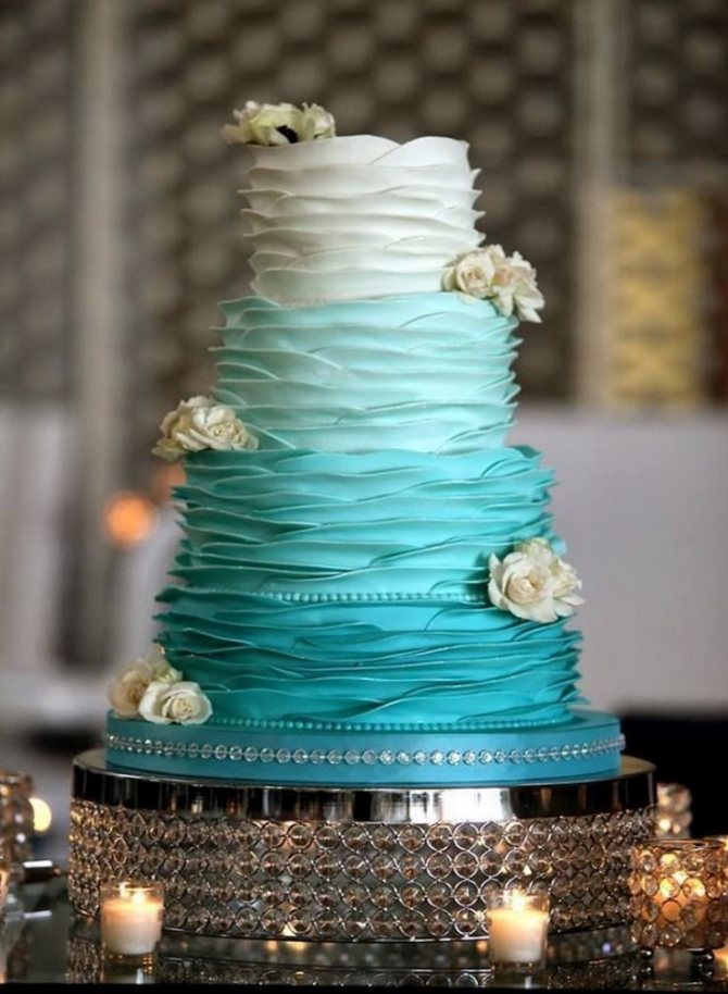 Стильно также будет смотреться торт, украшенный в стиле омбре, где происходит плавный переход от одного цвета к другому из яруса в ярус.