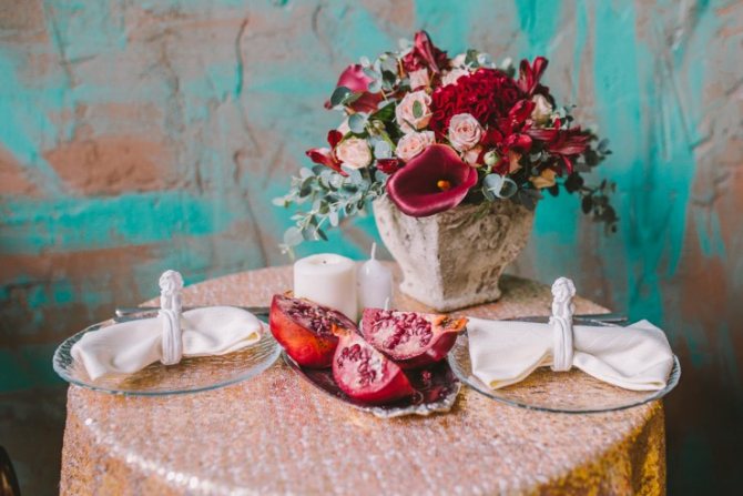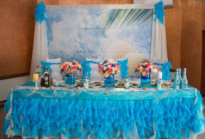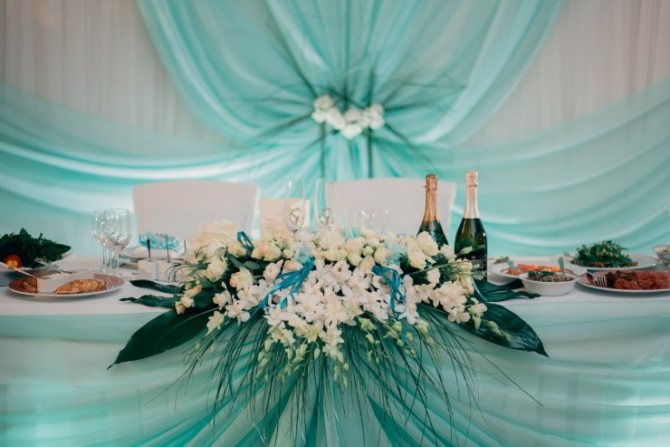 Украшение свадьбы бирюзовым цветом будет особенно актуально при проведении церемонии у моря, озера или другого источника воды. Если такового нет, то желательно, чтобы на территории ресторана, где проходит торжество, был небольшой фонтан, который подчеркнет «водную» тематику праздника.