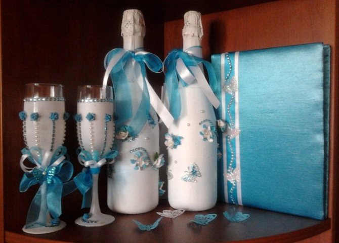 Свадебный зал можно также украсить цветами, гармонирующими с букетом невесты, либо воздушными шарами соответствующих оттенков. Уместным будет также оформление бокалов бусинами, ленточками или искусственными цветами тематического цвета.