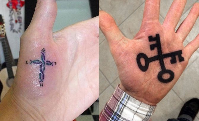 Мужские тату на ладони предполагают изображения животных, различную символику. К примеру, популярными среди представителей сильного пола являются ключи, якоря. Крест на ладони является символом страдания, объединяющим небо и землю, деревом жизни которую приходится прожить каждому человеку.