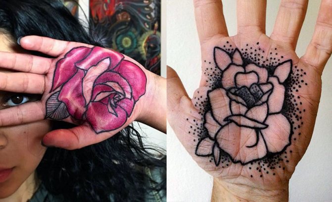 Тату роз на ладони в цветном и черно-белом исполнении