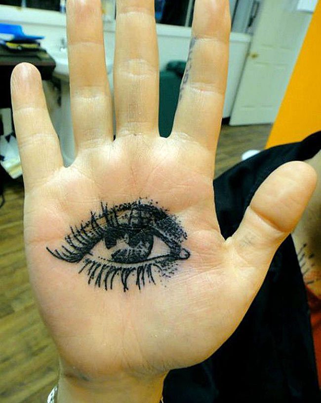 - Безболезненность. Как мы уже говорили, в местах, где присутствует большое количество мышц, либо жировая прослойка, болезненные ощущения во время нанесения татуировки на тело практически отсутствуют. И не важно, будет то большая или маленькая тату (татуировка глаз на ладони или тату надписи). Сам процесс нанесения татуировки на ребре, ладони относительно безболезненный. Кожа в этих местах плотная, что упрощает процесс нанесения и для вас, и для мастера.