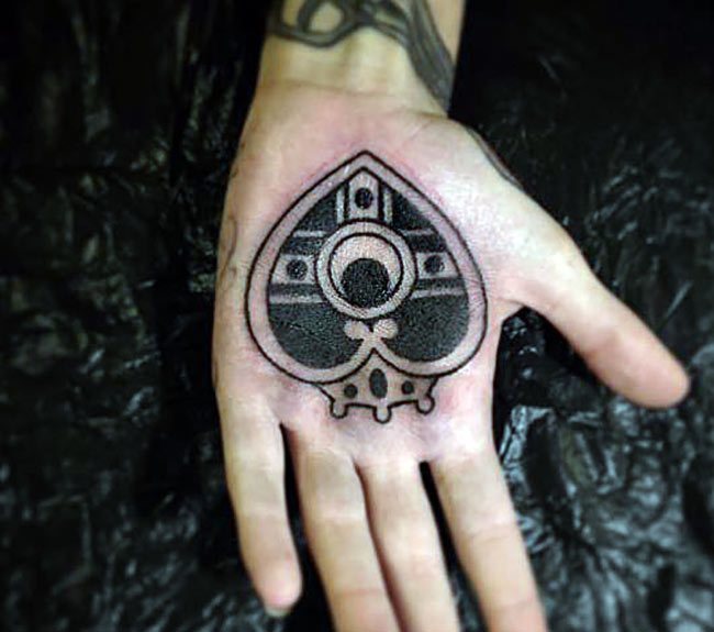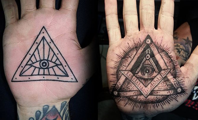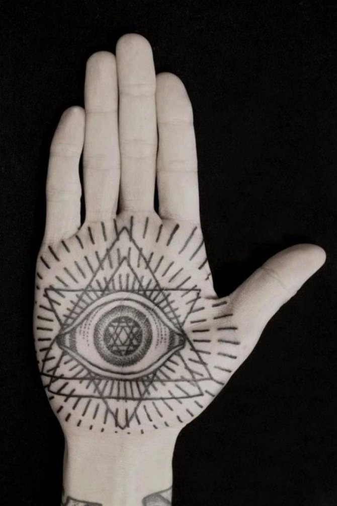 Многие спрашивают нас, что означает тату на ладони? Для каждого значение разное, однако оно также зависит от общепринятых канонов. К примеру, изображение глаза, заключенного в треугольник, является символом третьего глаза Будды (также трактуется, как всевидящее око, символ бдительности).