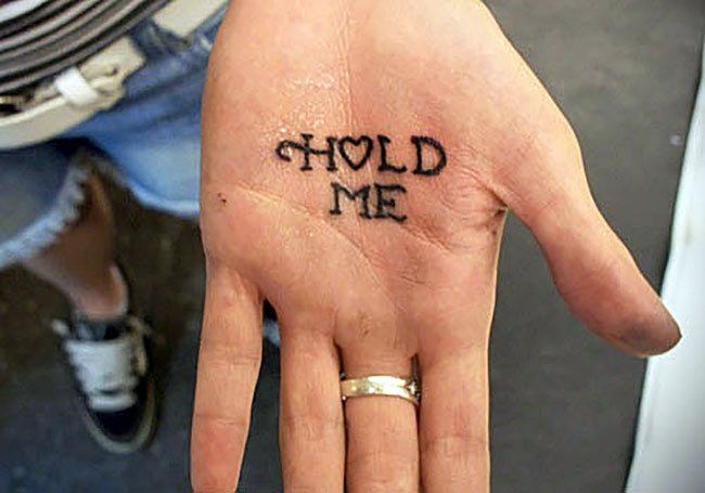 Достаточно часто любители нательных рисунков набивают на боковой части ладошки имя любимого человека и пишут короткие реалистичные высказывания, близкие к их сложившемуся мировоззрению.