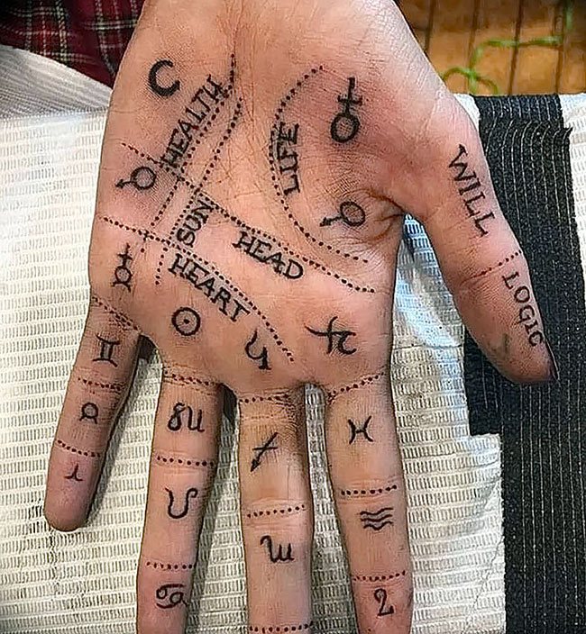 Есть несколько видов татуировок, которые используются при нанесении на ладони.