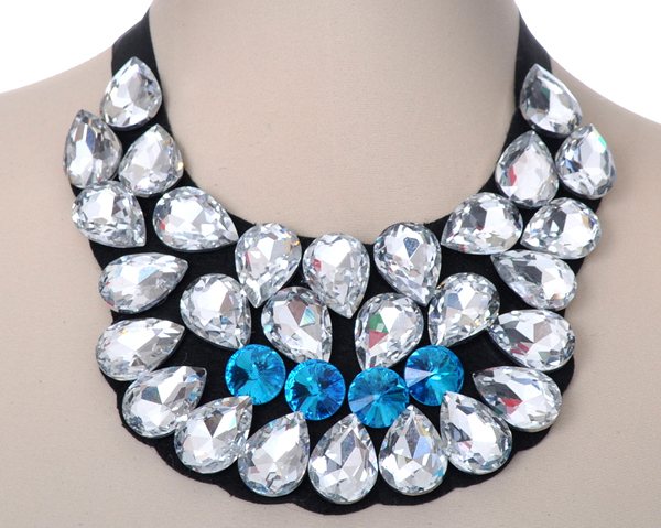 Воротничок выполнен в виде трех полукружьев, в центре которых помещены три крупные стразы, имитирующие огромные бриллианты.