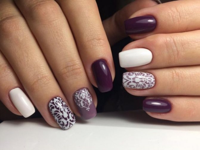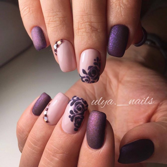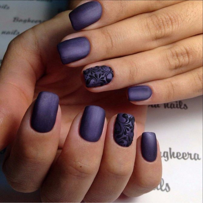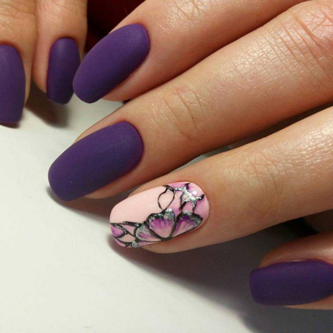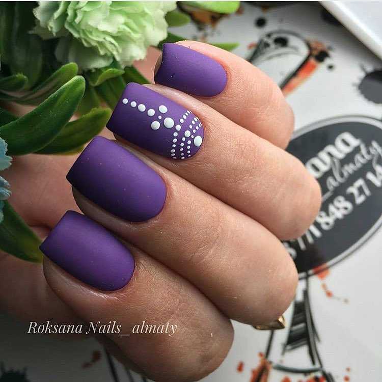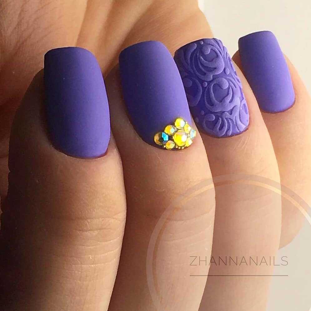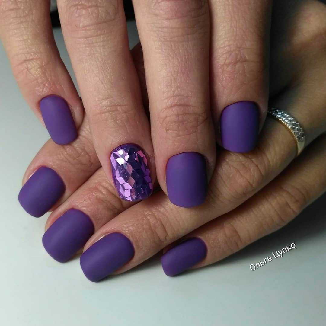 Даже в монохромном исполнении фиолетовый маникюр будет смотреться стильно и изысканно, особенно, если его сделать матовым. Гламурно будет смотреться фиолетовая втирка. Но при желании, его оттенки всегда можно совмещать с классическими цветами (белый, черный, серый и бежевый). В такой вариации он всегда будет выглядеть привлекательно.