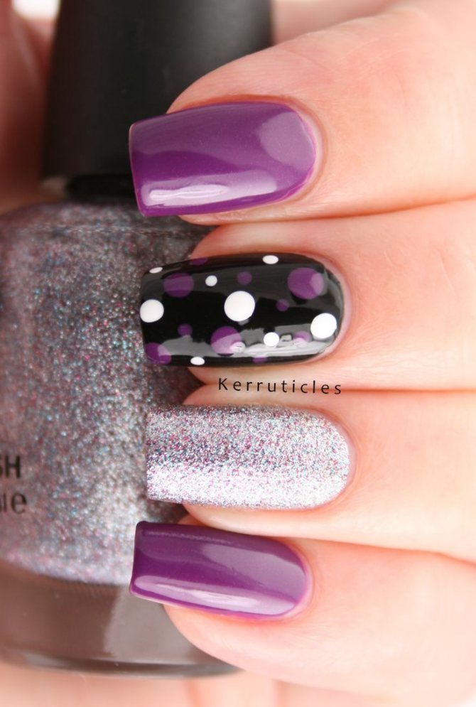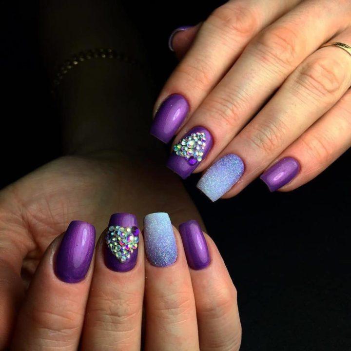 Фиолетовый маникюр с глиттером в том же оттенке либо серебристом цвете лучше всего сможет дополнить потрясающий дизайн фиолетовых ноготочков.