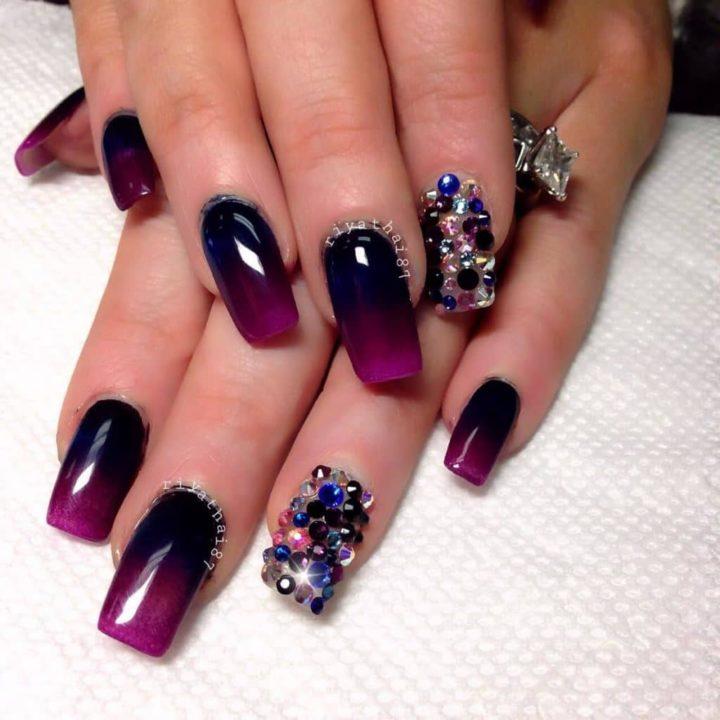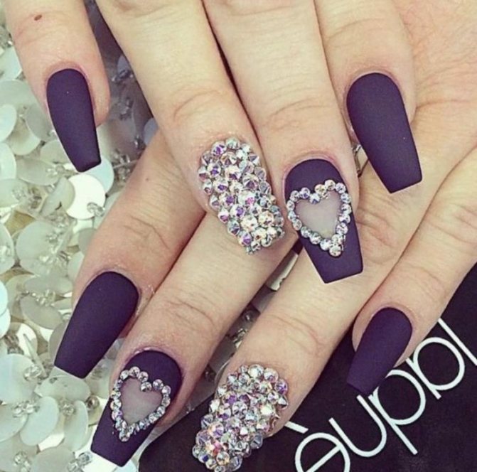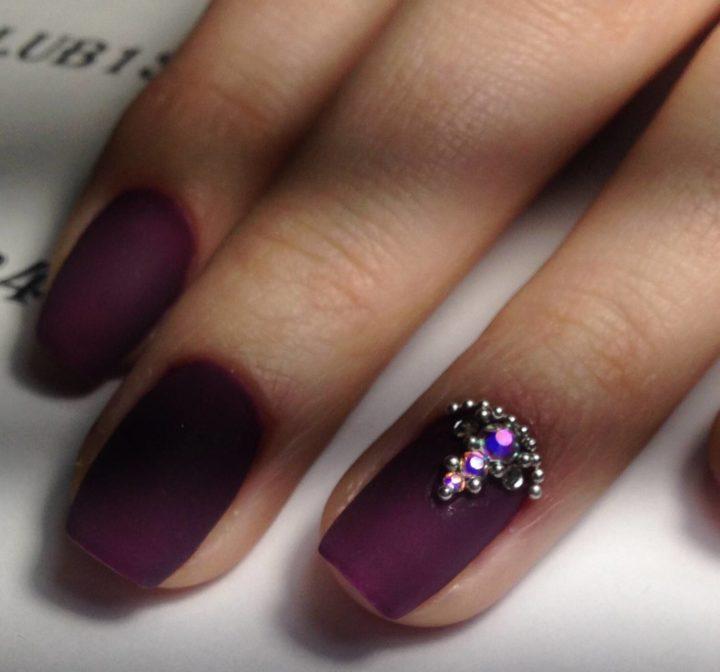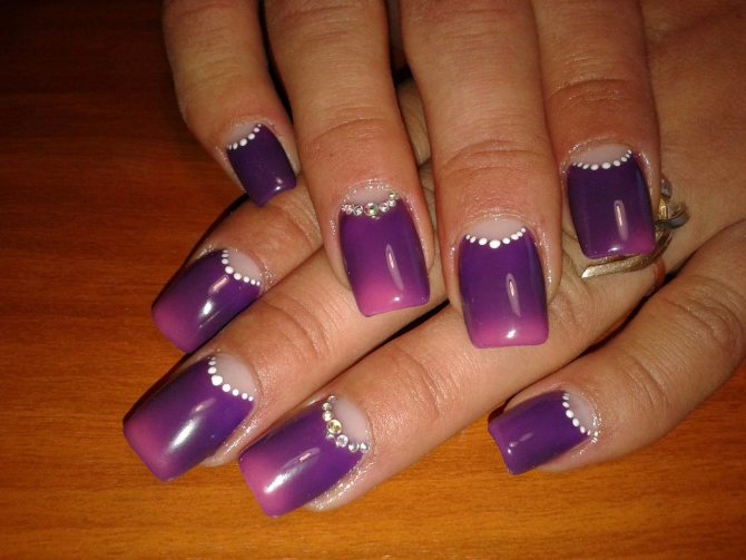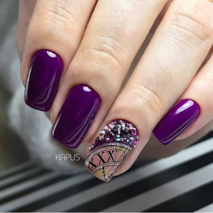 Данные декоративные элементы могут быть в разных стилях: форма, размер, цвет, что позволяет создавать дизайн ногтей в фиолетовом цвете со стразами на любой вкус.