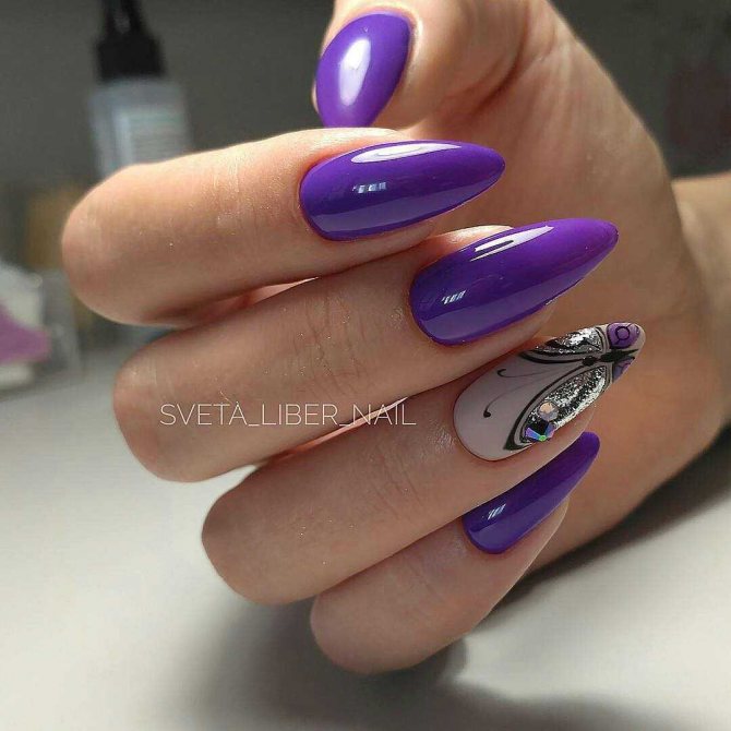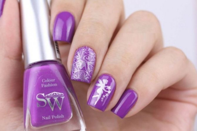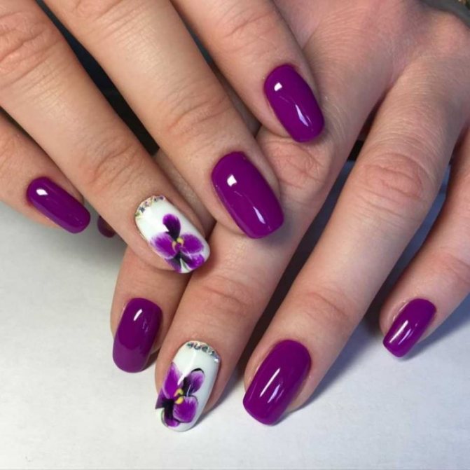 - фиолетовый – яркий и выразительный цвет, поэтому его можно использовать даже «в гордом одиночестве». Монотонный маникюр все равно не потеряет свою оригинальность и привлекательность.