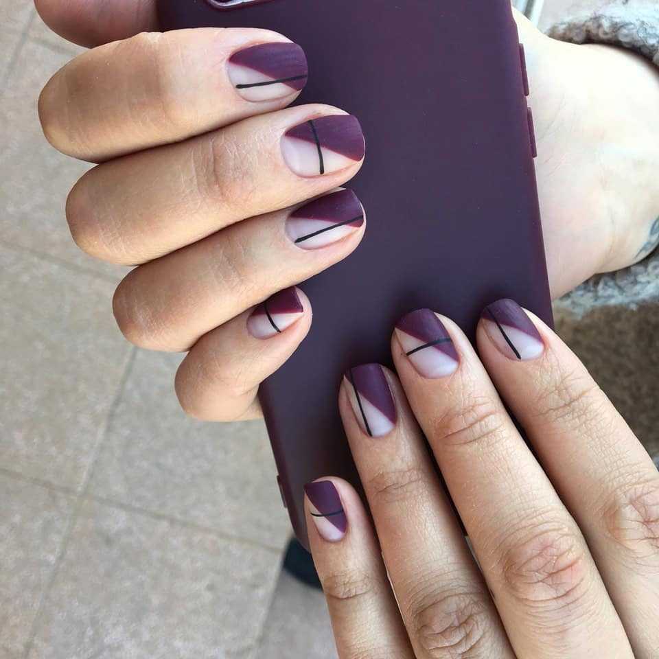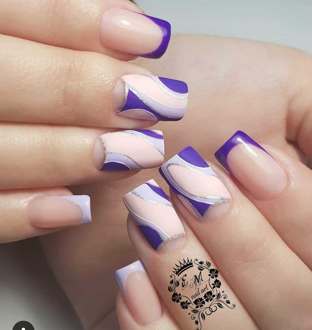Привлекательный фиолетовый маникюр 2021-2022 года с геометрией можно сделать с применением специальных трафаретов, а также в стиле «color block», «negative space», что позволят воссоздать удивительный и прелестный фиолетовый маникюр с геометрией.