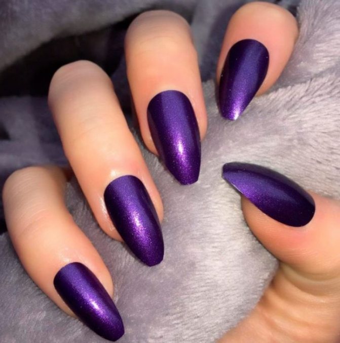 - фиолетовый маникюр — броский элемент look’а, позволяющий эффектно скрыть прочие недочеты аутфита,