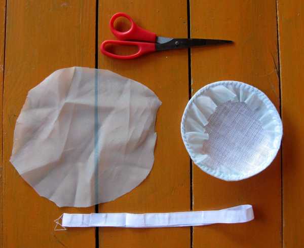 Заготовка драпируется атласной тканью (более плотная ткань накладывается в один слой). Края прячут под шляпку. После этого к изнанке пришивается подкладка. Для этого вырезаем из ткани круг радиусом 15 см.