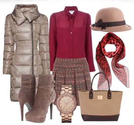 Отправляясь на деловую встречу, стоит отдать предпочтение элегантным и женственным вещам. Так, красиво и при этом сдержано будет выглядеть строгая зауженная темная юбка и светлая блуза с коричневым пальто темного или светлого оттенка. Однако такой образ не будет отличаться оригинальностью, если заранее не подумать о красивом ярком шарфике и стильных украшениях, отвечающих ему по цвету. Далее идеально подойдут теплые колготки под юбку, которые Вас согреют, а также придадут завершенности образу.